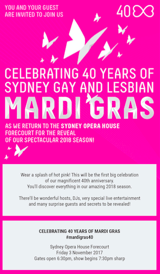 You have to love the Mardi Gras madness! The speakers were great, the Opera House looked hot, the entertainment was perfectly camp, the crowd was fun and diverse and spotted with a few celebs and community leaders and personalities, the Auslan interpreters worked hard for inclusivity and everyone came together to create a fun evolution into 40 that left us with one simple message to remember:Be proud, be strong, look after yourself, look after your mates, look after the community and have a happy (fucking) Mardi Gras!To check out all the 2018 Mardi Gras Festival events pick up a program (it’s hot pink, you can’t miss it) or visit http://www.mardigras.org.au/